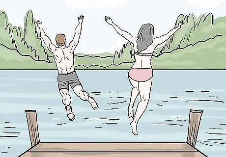 Swim in nearby lakes to cool down on a hot day. Check if there are any nearby lakes or beaches that you can go to near your campsite. Make sure they’re open to the public for swimming, or else you may not be able to stay there. Bring a small cooler with you with some food and water so you can enjoy a day on the lake and enjoy time away from your campsite. Be sure to wear sunscreen while you’re swimming so you don’t get any sunburn. Carefully read any warning signs near the lake or beach if there are any. Some campgrounds may have beaches with lifeguards on duty. If there isn’t a lifeguard, make sure you’re a strong swimmer and you stay at a depth where you feel comfortable.