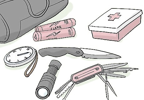 Pack basic survival kits so you can set up your site easily. Basic survival kits include items like pocket knives, flashlights, first aid supplies, and multipurpose tools so you can stay safe while you’re camping. You can either buy prepackaged camping kits or you can make your own and carry it in a toolbox. Make sure you have a kit of materials with you in case there's an emergency or if you need to do maintenance on site. Some basic things to include in your kit are knives, bandages, antiseptic wipes, lighters, and emergency flares.