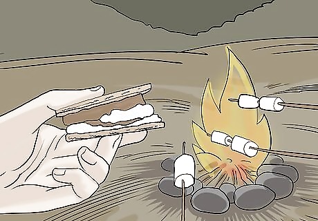 Make s’mores around the campfire for a sweet treat. Break a graham cracker in half and place a piece of chocolate bar on top of one of the pieces. Roast a marshmallow over your campfire until it’s golden brown, or until it feels gooey when you squeeze it. Put the roasted marshmallow on top of the chocolate and set the other half of the graham cracker on top to finish your treat. Try using different types of candy when you make your s'mores for different flavors. For example, use a peanut butter cup instead of a chocolate bar for a sweet and salty taste.