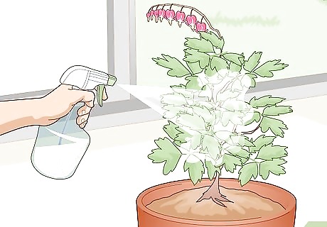 Mist an indoor bleeding heart daily during spring and summer. Since bleeding hearts grow well in a humid environment, raise the humidity in your room using a spray bottle. Give the area around your plant 3-4 spritzes with your mister to moisten the air. Do this once a day in spring and summer. If you live in a very humid area, you may not need to mist your plant. If it’s not thriving, however, try spraying the air daily to see if that helps. Outdoor plants likely won’t need to be misted at all. However, if your area is try, spraying it daily may help your plant thrive.