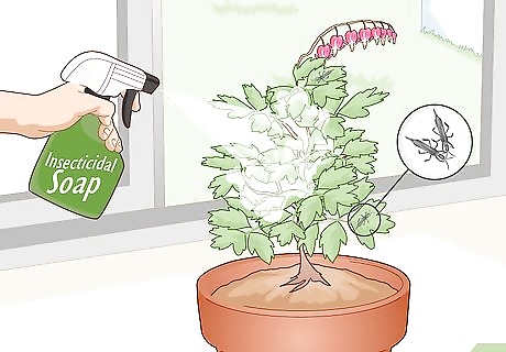 Spray the plant with insecticidal soap if you see insects on it. While bleeding hearts don't typically attract pests, spider mites, aphids, and mealybugs may be attracted to the leaves. If you see insects on your plant, use a spray bottle to mist it with an insecticidal soap. This will rinse away the bugs and possibly kill them. Don’t spray your plant with an insecticidal soap unless you see insects on your plants. Bleeding hearts can be sensitive during growing season, so over-treating it could affect how your plant blossoms.