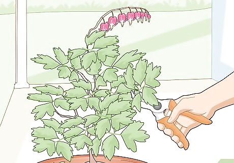 Prune your bleeding heart in late-fall when the growing season is over. You don’t need to prune a growing bleeding heart while it's in bloom, but cut it back before the dormant season. Use pruning shears to trim the stems and leaves in late October or early November. Cut it back to about 1/3 its original size. Your bleeding heart will still grow back the next spring, as long as the roots are healthy. Keep in mind that flowers only bloom on new growth, so you don’t want a lot of old growth on the plant when growing season starts.Warning: Don’t prune your bleeding heart at all during the growing season. Otherwise, it won’t produce blossoms because the flowers only grow on new growth.