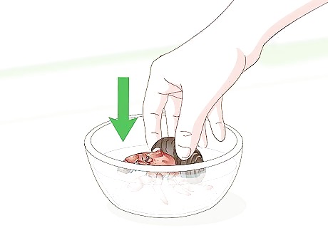 Bathe new hermit crabs and recently molted crabs. Although you can generally let the crabs bathe whenever they feel like it, if you are introducing a new crab to the crabitat, or one of your crabs has just emerged from molting, you should give it a quick bath. Pour some tepid, dechlorinated saltwater into a shallow dish and place your hermit crab in the water. Let it sit fully immersed in the water for about 1 minute. Then, take it out of the bath and put it in a safe, enclosed space to dry. Once it’s fully dry, you can put it into the crabitat with the others. Try to get your hermit crab to walk down your arm or hand and get into the water himself. If that doesn’t work, gently lift him by the shell and lower him into the bath. Always supervise a bathing crab. It can get really active after bathing, so even if it’s sitting at the bottom of the water at one moment, it might be scurrying out and getting lost in your house in the blink of an eye. Your drying off area can be as simple as a cardboard box lined with paper towels to absorb the excess moisture.