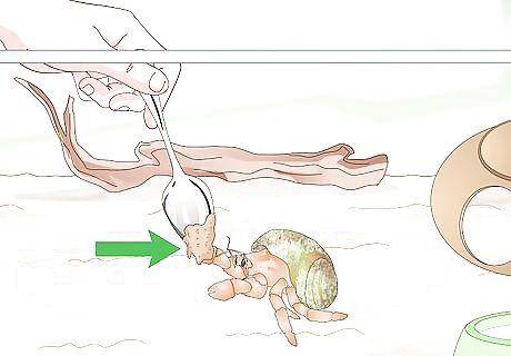Feed your crabs commercial crab food daily. Feed your hermit crab a high-quality food that’s specifically made for hermit crabs. Find it in your local pet store or online. Check the label on the food to see how much to feed them each day. You may want to alternate between several different foods. Hermit crabs love to have variety in their diet. Small crabs will usually need about 1 small spoonful of food per day. Avoid any food that contains copper sulfate or ethoxyquin.