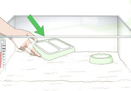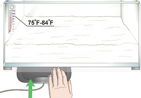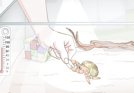 Keep the crabitat between 75 °F (24 °C) and 84 °F (29 °C). To do this, find an under tank heater or heat lamps at your local pet store. Buy a thermometer or hydrometer to measure the ambient air temperature in the tank as well. When using a 10 US gal (38 l) tank, the best way to heat the tank is with an under the tank heater (usually referred to as a UTH). These are small pads that stick to the outside glass of the enclosure and usually raise the temperature up between 4 and 6 degrees. Try placing the unit on the bottom of the tank. Even with a thick layer of substrate the UTH will be effective. Heat lights work great on larger enclosures and can usually heat the tank to any temperature. A 40 watt light will do nicely on a 10 US gal (38 L) tank. Heat lights do dry out the tank very quickly, however, so you may have to spray the inside of the tank more often. Make sure that the heat source is placed on one side of the tank, and not in the middle. This is so the tank has a warm and cool side so the crabs can be around whatever temperature they prefer.
