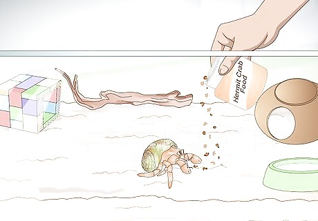 Feed the crabs at night. Hermit crabs are nocturnal, so it’s best to feed them in the evening. Try setting a timer to remind yourself. Make feeding and cleaning part of your daily routine. Feed your hermit crabs at the same time every evening, and then take away any uneaten food the next morning. You can keep dry food in the crabitat for 2 days, but be sure to remove any fresh food daily. Hermit crabs eat very little and in small amounts. To put it in perspective, most hermit crabs take a few hours to eat half a cheerio. So don't think that your hermit crabs are starving, because they aren't!