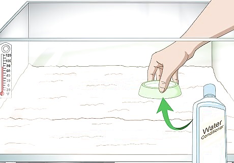 Provide dechlorinated drinking water in a non-metallic dish. To dechlorinate drinking water for your crabs at home, buy a small bottle of tap water conditioner in the fish section of your pet store. Follow the instructions for making 1 US gal (3.8 l) of water. Hermit crabs cannot drink tap water. This water is treated with chlorine which can cause permanent blisters on the crabs' gills. It's a lot easier to have a batch of water ready to use for the next few weeks or so rather than having to make a small amount every day. Look for a conditioner that removes chlorine and chloramine and neutralizes heavy metals.