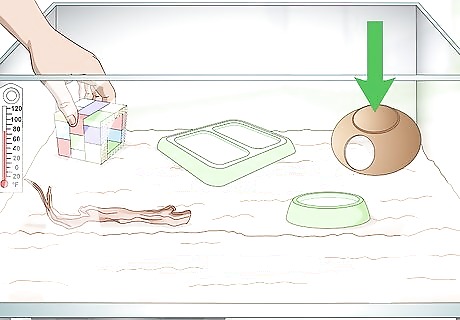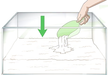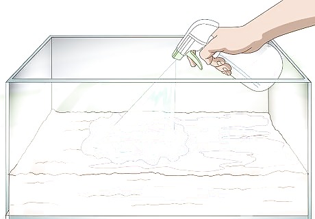 Fill the bottom of the tank with sand or coconut fiber. Hermit crabs require a deep substrate at least twice the height of your largest crab. The crabs will burrow themselves into the substrate to molt (shedding their exoskeleton to grow). You can use sand, coconut fiber, or a mixture of the two for your crabitat. Medium crabs (golf ball size) need at least 8 inches (20 cm) of substrate for molting. Small crabs (quarter size) need 6 inches (15 cm). Tiny crabs (often called "micros", the size of a dime) need 4 inches (10 cm) of substrate. Examine the substrate carefully before putting it in the crabitat. Sift some through your fingers and check for insects. Be sure to smell it, too. Sand that smells moldy has probably been contaminated.