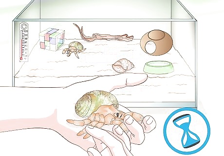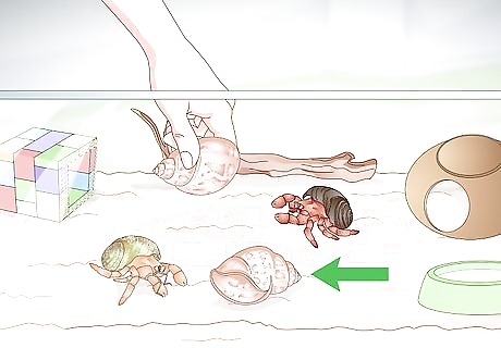 Keep handling to a minimum. Avoid touching or handling your hermit crabs as much as possible. It can stress them out or even cause injury if you touch a molting crab. If you must pick them up or handle them, always grab them gently by the shell. Even if your hermit crab knows and likes you, it may still pinch you if it becomes frightened. Be sure to handle the crab gently and carefully.