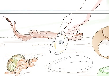 Add shells to the crabitat so the crabs can upgrade their housing as necessary. Hermit crabs do not grow their own shell. They take them from dead gastropods like snails. In captivity, you need to ensure that there is a wide variety of shells to choose from. You can tell if a hermit crab's shell fits if it can seal the opening of the shell with its large claw and armor leg (back left). As a general rule, land hermit crabs prefer shells with round openings. You can get inexpensive shells from craft stores. Another great place is online. Boil the shells for 20 minutes & drain them before putting them in the crabitat. If its legs stick out a bit and you can still see its eyes, the hermit crab will be on the market for a new shell. Simply drop some shells in the tank and the hermit crab will change when ready. You can dip the shells in salt water periodically to draw the crabs’ attention to them if you wish.