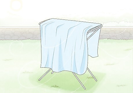 Dry the garment. Dry rayon knits flat. Use a sweater drying cage to drape the rayon over, or lay the rayon over the top of a drying rack so that it sits flat across multiple bars. Woven rayon can be hung to dry. Simply clip to a drying rack or use a hanger. Avoid using a dryer or anything that may tumble the clothes, as this may damage or rip the fabric. A knit fabric will stretch in all directions, while a woven fabric will only stretch diagonally. Try stretching your fabric lightly both side to side and diagonally to tell. If it only stretches diagonally, it is woven.