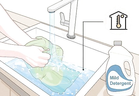 Hand wash your rayon. Your tag will tell you what, exactly, you need to take care of your rayon piece. The general standard, though, is a mild detergent and warm water. Fill a clean sink or basin with water slightly above room temperature. Add a mild detergent, such as one that says it is made for delicate fabrics. Soak your rayon fabric in the basin until it completely wet. Then, gently swirl your fabric around the basin using your hands. Avoid harsh or rapid movements, such as those that would cause a splash. Agitate your fabric for three to five minutes. Remove the fabric from the basin and rinse under a faucet of warm water until suds stop forming. Gently squeeze the excess water out from the fabric. Avoid harsh wringing and twisting of the fabric.