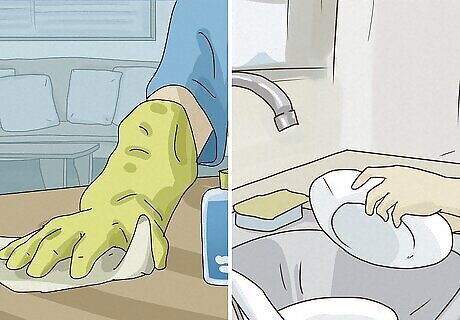 Clean your home thoroughly and remove all leavened products. It's customary to do a thorough cleaning of every nook and cranny of your home in the weeks leading up to Passover. Dust, mop, sweep, and wipe each surface in your home. Also, scrub all of the dishes and utensils you plan to use, especially the ones you're using for the seder meals. This process is called “kashering” which means to make Kosher through rigorous cleaning.