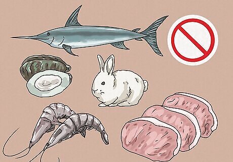 Avoid all non-kosher and other forbidden foods. As throughout the year, during Passover, you aren't allowed to eat certain non-kosher meats such as pork, shellfish, lobster, shrimp, crab, rabbit, and any seafood without fins or scales, such as swordfish and sturgeon. You also can't eat any products made with these ingredients. It is also tradition to not eat meat in combination with dairy during Passover (as well as all year around) in accordance with regular Jewish dietary laws. So, avoid cheese, butter, or cream sauce on beef or chicken.