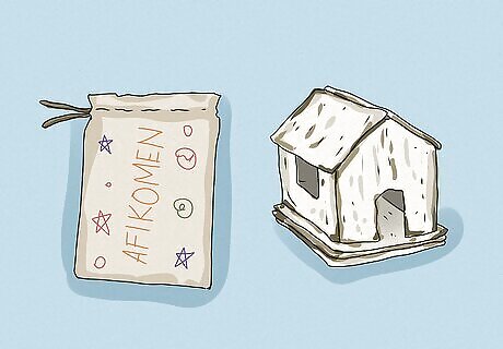 Make Passover crafts with your kids. There are so many cute crafts you can make with children to get them involved with and excited about the holiday. Crafting also gives you an opportunity to explain the importance of Passover to your kids. Make a matzo house. This can be done similarly to making a gingerbread house and makes a great centerpiece. Make it extra exciting for the kids by building the matzo house with chocolate and caramel. Just be sure any candy you use is kosher for Passover. Make a Passover seder plate. You can get your kids to make and decorate a plate and bowls for the seder plate. This can be a good Passover activity for children of any age group. Make an afikomen bag. You can also make a custom bag for the afikoman. Sew or buy a basic bag and let your kids decorate it with drawings, baubles, or any images related to Passover.