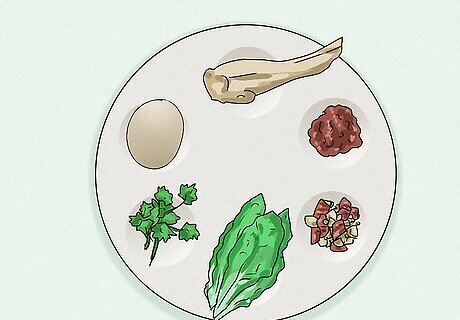 Put together a traditional seder plate with symbolic foods. The seder plate plays a central role in the Passover celebration. It consists of 6 symbolic foods, plus 3 pieces of matzah which will be placed on a separate plate. The 6 symbolic foods are: The bitter herbs: traditionally this is horseradish, but parsley, green onion, or celery can also be used. The paste or charoset: a sweet mixture that represents the mortar used by the slaves to build the pyramids of Egypt. It's usually a ground mixture of apples, nuts, and wine. The vegetable: this is a non-bitter, root vegetable such as a boiled potato. It represents the hard labor of the slaves. The shankbone: this is usually lamb or goat, which symbolizes the sacrificial lamb of Passover. The egg: a hard-boiled egg used to symbolize the offering made in the days of the Temple. The lettuce: this is usually romaine and symbolizes the bitterness of slavery (similar to the bitter herbs).