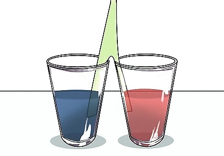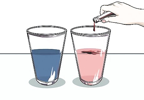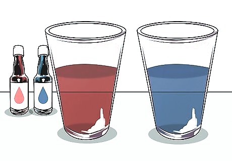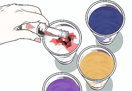Fill the glasses half-full with water and add food coloring. Using regular tap water, fill each glass about halfway. Add a few drops of different food coloring to each glass. The more drops you add, the more vibrant the celery stalk will become with that color. Use 2 colors that blend well such as red and blue to make purple or red and yellow to make orange.