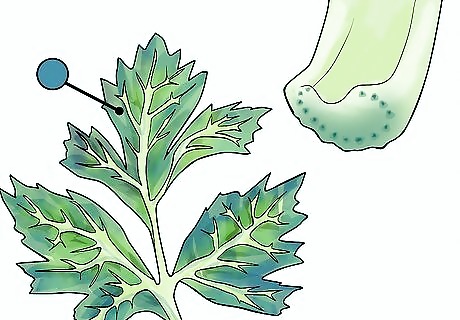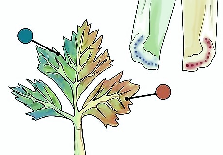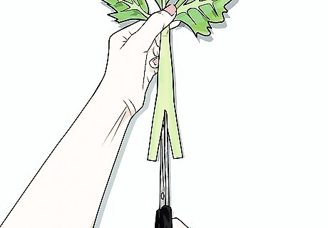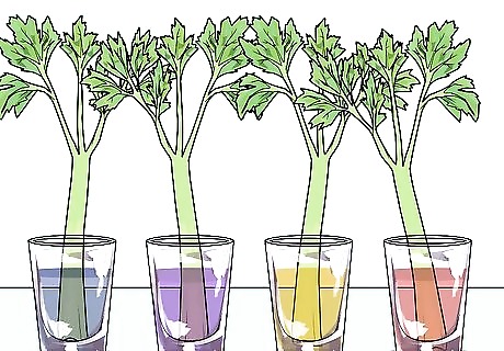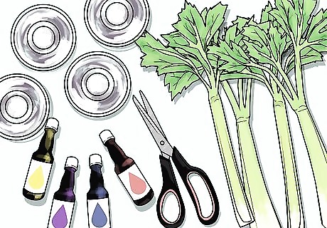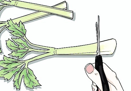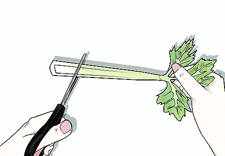Cut the bottom off the celery stalk. You want to use a fresh part of the stalk and expose the bottom so that it can take up the most water. Ask a parent to assist with this step. Using scissors or a knife, trim the curved part of the bottom of the stalk off. Leave the leafy top on the stalk. The leafy parts will change color as well.