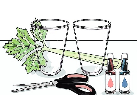 Gather the necessary materials. This is a variant of the original experiment where you will cut one stalk partially in half leaving the leafy top part intact. Each half will then be placed in a different color liquid to see what happens. To do this, you will need 1 stalk of celery, 2 glasses, water, scissors, and 2 different colors of food coloring. Make sure the celery still has the leafy bits at the top. Parental supervision/assistance is recommended for cutting the celery.
