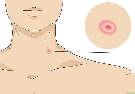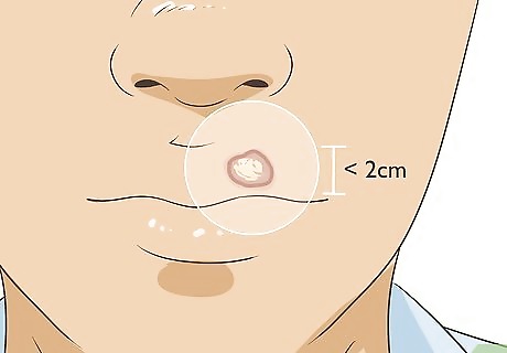 Watch out for basal cell carcinoma. Basal cell carcinoma is the most common form of skin cancer. It is most often found in the sun-exposed areas of the head, including the ears and neck. It is erosive in nature, which means the local skin invasion of the cancer eats into the tissue it affects. It metastasizes, or spreads, to other sites on the body. Risk factors for this include sun exposure, tanning bed use, tendency to freckle, fair skin, number of blistering sunburns in your lifetime, and history of smoking. The lesions are flat or slightly raised, pink or flesh-colored, bleed easily, and have a type of hole in them. They have appearance of eroded flesh and can look like a sore or lesion which oozes, crusts, and doesn't heal. The lesions typically range in size from 1 to 2 cm.