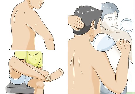 Perform a skin survey. The best way to check yourself for skin cancer is to do a self-examination, or survey. When performing your skin survey, choose a particular day during the month and note it on the calendar. Evaluate each area of your skin, leaving no part unseen. After you look at all the easily seen areas, use a mirror to evaluate the genitals, the anal area, between the toes, your back, and any other hard to see area. It may be helpful to have an image of a body chart and check off areas as you check them on yourself, as well as make note of any moles or markings you find. For examining your scalp, enlist the help of a friend, partner, or spouse. Part your hair in small sections looking and feeling for erosions, scales, or discolored lesions. With the advent of tanning booths and full-body tans, you can end up with skin cancer on the vulva and penis. Take your skin survey seriously and leave no surface unexamined. The best way to adequately perform this survey is to know what each different kind of skin cancer looks like.