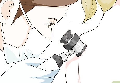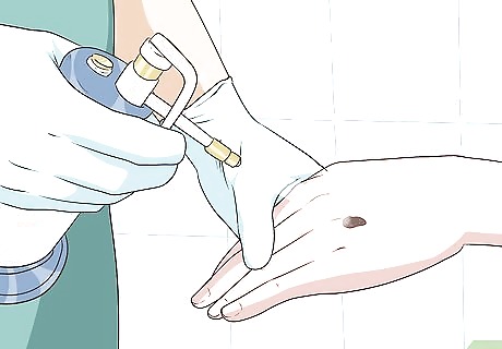 Get clinical diagnosis. After you notice the lesions on your body, you need to have it clinically checked by a dermatologist. This is so you can figure out they indicate skin cancer and, if so, which stage it has reached. Once the specific kind is determined based on your lesion's physical characteristics, your doctor will discuss your options with you, depending on your particular situation. The doctor may decide on surgical excision right away if it is certain that your cancer needs that. If the doctor is less certain, they may choose to perform a dermatoscopy, which is a procedure where the lesion is reviewed under high-powered microscope. Keep in mind that there are many skin changes — including new and changing moles and lesions — that are not cancer. Only an experienced physician can evaluate and help you decide if further evaluation or treatment is needed, so always err on the side of caution and get checked out. Your doctor may also use a confocal scanning laser microscopy (CSLM), which is a non-invasive imaging study that provides pictures of the epidermis and the papillary dermis in real time. This will help distinguish benign from malignant lesions. Your doctor may also opt for a biopsy. Although it is a good test that is still used, a biopsy is not always 100% certain. These techniques further allow your provider to recognize a melanoma and distinguish clinically between other difficult to diagnose lesions.