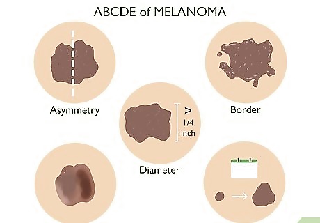 Recognize the characteristics of melanoma. Early detection is especially important with melanoma. It is the most deadly of all skin cancers. Melanoma can be cured if it is caught early during stage one. As the cancer advances to late stage cancer, the survival rate for more than a few years is less than 15%. The skin lesions associated with melanoma have certain characteristics that can be looked for when checking yourself for skin cancer, which are based on an ABCDE scheme. A stands for the typical asymmetry within the skin region, where one half does not match the other half. You should also look for a Border, which will be irregular, ragged or notched, jagged, and not sharp or crisp. The Color will also change across the skin area with a kind of tie-dye effect with blacks, browns, and blues. You must also look for the Diameter of the lesion. It will likely be larger than six mm, or just a bit over a 1/4 an inch in size. You will also notice the mole or lesion Evolve, or change, its appearance over time. People with darker skin color must be aware that they are at risk for cancer as well — in particular a dangerous form of melanoma that is not caused by sun exposure, called acral lentiginous melanoma (ALM). It is typically found on the palms of the hands, soles of the feet, or even under the nails.