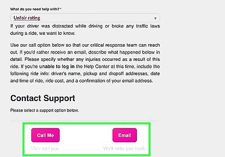 Tap Call Me, or Email. You will be contacted by a Lyft customer support representative. They cannot tell you what comments a driver or passenger said about your, but you can ask for your driver or passenger rating. Remember to always be respectful and courteous when speaking with help center representatives.