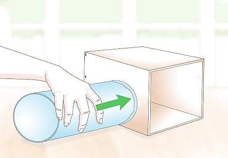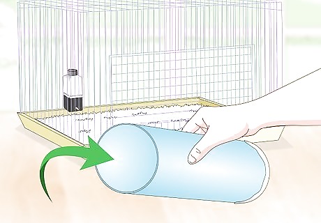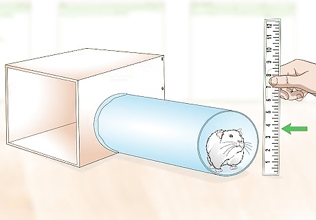 Use a PVC pipe to build a durable hideaway. Find a pipe that is around 6 inches (15 cm) (152 mm) in diameter. Cut the pipe to between 1 and 2 feet (.3 to .6 m) long. Then, block one side of the tube with cardboard or newspaper. Find a cozy spot in your hamster’s cage to place your new hideaway. Sand down any rough or sharp edges on the ends of the pipe. Avoid reusing an old PVC pipe that has had chemicals run through it or is brittle. While a PVC hideaway may be cheap, it could also contain potentially toxic chemicals. Consult your veterinarian before using one.