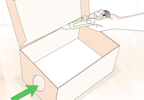 Construct a hideaway with cardboard if you're on a budget. Find a small box that is about a foot long (.3 m) and six inches (152 mm) high. A small shoe box will work well. Then, remove the top and cut a hamster-sized hole in one end of the box. Place the box in your hamster’s cage so that the missing top is on the ground. If you can’t find a small box, cut a larger box to the same dimensions. Cardboard hideaways will have to be discarded whenever you clean your cage. Remove plastic, glue, and anything else that could be harmful to your hamster.