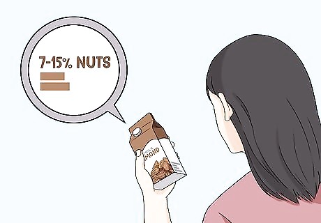 Check the percentage of nuts a milk contains before buying it. Not all brands and types of nut milk are made using the same percentage of nuts. For example, a lot of almond milk contains only 2% almonds, and most macadamia nut milk contains only 3% macadamia nuts. In both cases, the remaining percentage is mostly water and possibly some other additives like carrageenan or vegetable gum. You may wish to select a type of nut milk based on not just which nut is used, but also what other contents are added to the milk. When buying nut milk, check the container for the percentage of that nut it contains. You may be able to purchase nut milk that contains as much as 7-15% nuts.