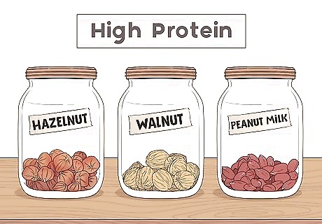 Select hazelnut, walnut, or peanut milk if you want nut milk that has lots of protein. Dairy milk offers a very decent amount of protein (1 cup (240 mL) of 2% cow’s milk contains 8 grams (0.28 oz) of protein), but not all types of nut milk have much protein. If you want to keep your protein intake up, you’ll want to select hazelnut, walnut, and peanut milk. Cashew milk actually has the lowest protein content of all nut milk. While hazelnut, walnut, and peanut milk all have protein in them, none of them has as much protein as cow’s milk. For example, 1 cup (240 mL) of either hazelnut or walnut milk contains only 3 grams (0.11 oz) of protein and 1 cup (240 mL) of peanut milk contains 6 grams (0.21 oz) of protein.