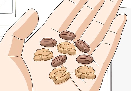 Try a variety of nuts. Nuts, such as walnuts and almonds are an excellent source of protein and can actually help to lower cholesterol. Nuts have a number of nutritional benefits and contain unsaturated fats, omega-3 fatty acids, fiber, and vitamin E. They can be purchased year round and are typically harvested in the fall and early winter months. You can eat nuts on their own as a healthy afternoon snack, or add them to your salads, granola, or yogurt.