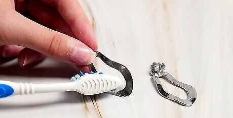 Clean most earrings with soapy water. Mix together 1 US quart (950 mL) warm (not hot!) water and 2 tablespoons (30 mL) of gentle dishwashing liquid, such as Dawn dish soap. Soak your jewelry in the water for 10-20 minutes, then gently scrub them with a soft-bristled brush.Tip: Wet the toothbrush with warm water before you scrub the earrings for extra cleansing power. Rinse the earrings with clean water and dry them with a lint-free microfiber cloth until no moisture remains. This method is safe for almost any common type of earring, including those made with stainless steel, nickel, and copper. You can also use soapy water to clean pearls and hard gemstones like quartz, diamonds, sapphires, and aquamarines. Emeralds and amethysts can also be cleaned with soapy water. However, emeralds shouldn’t be left to soak, and amethysts should be “dried with a paper towel followed by an air can,” says expert jeweler Mark Sandler, “although taking [amethysts] to a professional is easier and they usually don’t charge anything.”
