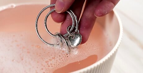 Wipe down earrings with hydrogen peroxide or rubbing alcohol. Saturate a cotton ball in one of the two solutions and dab it all over the earring to disinfect it. Rinse the earrings in a bowl of water. For a deeper clean, let your earrings soak in a small cup of hydrogen peroxide or isopropyl alcohol for 5-10 minutes before rinsing in a bowl of water.Tip: Using hydrogen peroxide with cotton pads or balls is great for earrings with lots of small details. When you’re done sanitizing your earrings, set them on a clean cloth to dry. Touch them a few times to test whether they’re dry, then put them away or wear them when they’re ready. Test the chemicals on the backside of an earring first to make sure they won’t damage your jewelry. Avoid using hydrogen peroxide on fine jewelry like diamonds, and avoid using rubbing alcohol on jewelry that has resin, clay, or plastic materials. In these situations, using dish soap may be a safer option.