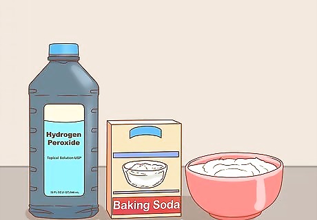 Mix baking soda and hydrogen peroxide in a small bowl. Start with a tablespoon of hydrogen peroxide and add it to your baking soda. Continue to add hydrogen peroxide as you mix it until you’ve got a thick paste. Your mixture should be malleable, but firm. Mix the baking soda with water instead of hydrogen peroxide for oil-based stains.