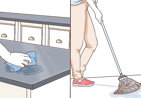 Use a microfiber cloth for smaller jobs and a mop for bigger areas. A small microfiber cloth works best for small tables or countertops. You may want to use a larger microfiber cloth for bigger surface areas. If you have a large area of granite flooring that you need to clean, consider using a mop. Whether you use a mop or a microfiber, make sure that it is clean first. An abrasive sponge, like a scotch-brite sponge, will scratch your granite, so it's best to avoid using sponges like these.