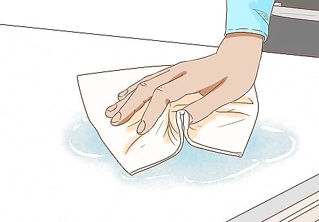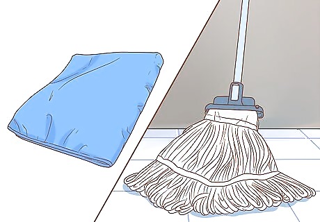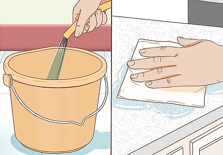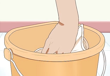 Submerge your cloth, rag, or mop in your cleaning solution and wring it out. Let your cloth or rag rest in the solution for a moment so that it soaks thoroughly. Once it’s soaked, lift it out of the solution and wring it into your bucket or sink to remove the excess water and soap. You want your cloth, rag, or mop to be damp, but not soaked. If it’s dripping with water, wring it out further by twisting it in your hand.