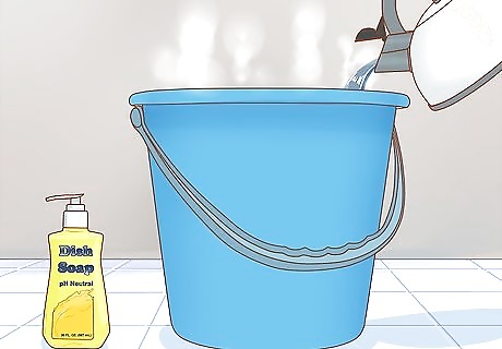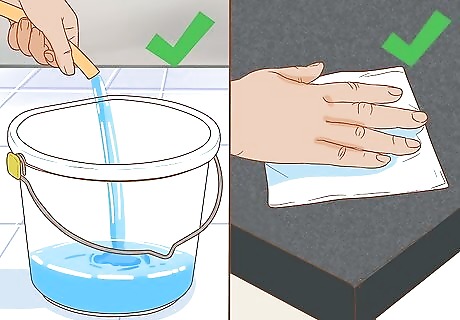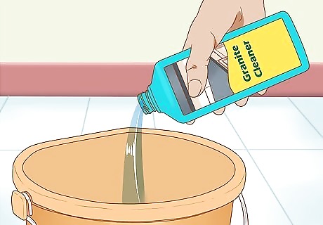Fill your bucket or sink with a specialized cleaner. There are several companies that produce specialized cleaning solutions for granite. You can purchase most of them at your local hardware store, found alongside other cleaning supplies. These solutions will remove residue that some dish soaps may leave behind. You can also use warm water and 2 teaspoons of dishwashing soap if you don’t have any granite-specific cleaner around, but a special granite cleaner is designed to keep granite healthy during a deep clean.