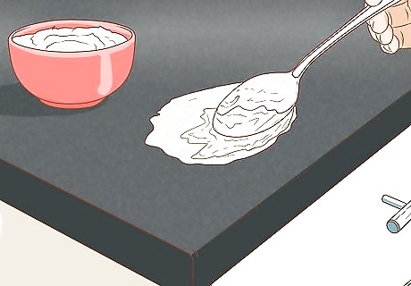 Spread your paste over the stain and cover it with plastic wrap. Evenly spread the paste across your stain with a spoon. Take a sheet of plastic wrap and cover the paste. Apply light pressure to the plastic wrap so that it’s lightly pressing down on the paste. Tape your plastic wrap to your table, countertop, or floor. Any kind of tape can work, but painter’s tape is the least likely to leave a residue on your granite when you take it off.