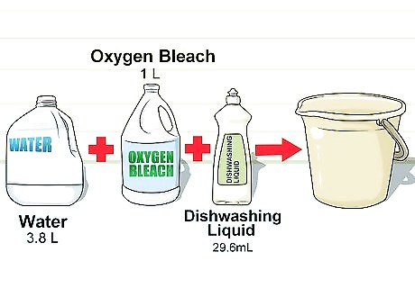 Create a solution with oxygen bleach powder to remove mildew. For tougher stains, like mildew, use a solution made out of oxygen bleach, water, and dishwashing liquid. Put a gallon (3.8 L) of water, one-quarter pound (1 L) of oxygen bleach, and a one-eighth cup (29.6 mL) of dishwashing liquid in a bucket. Dip a scrub brush in the bucket and scrub the mildew until it lifts. Be very careful when handling bleach. Make sure to wear eye protection, rubber gloves, and handle it in a well-ventilated area.
