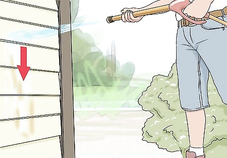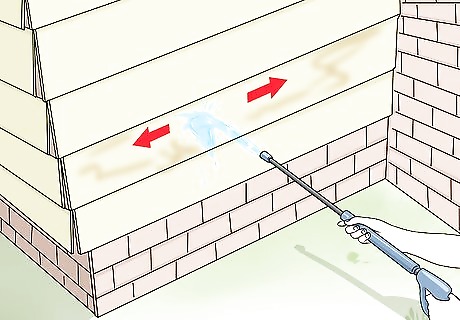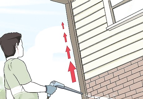 Spray downward. Begin pressure washing by spraying at a downward angle. Spraying at an upward angle can cause water to get trapped in the cracks or seams, which can cause damage to your house later on.