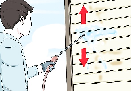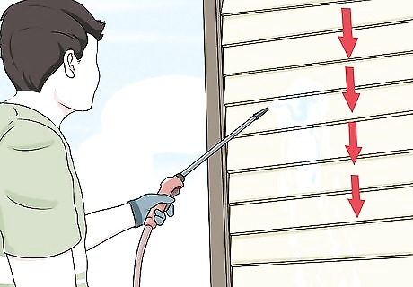 Work from the bottom to the top. Spray your hose at a downward angle. Work from the bottom to the top of the house. Work in small, separate sections at a time.