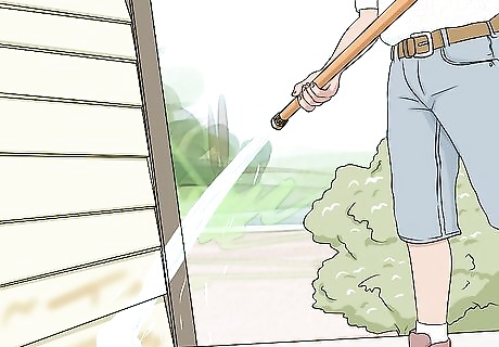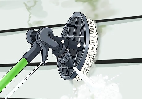 Use a cleaning kit or brush to clean the outside of your house. You can buy a siding cleaning kit with a nozzle attachment from your local home improvement store. Or, you can buy an automobile brush that will attach to your hose. You can use only water to clean if your house isn't heavily soiled. If it is, you will need to use a cleanser. A siding kit should come with a compartment to pour the cleanser into the attachment. You can find cleanser specifically made for washing the outside of houses at most home improvement stores.