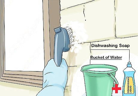 Use soap and water to remove stains. Inspect your home before you begin cleaning. Look for stains that can be cleaned without the use of a garden hose or pressure washing. For most stains, you can use a scrub brush, water, and regular dishwashing soap. Scrub the stain until it begins to lift. Avoid using heavier cleaners if possible since they could damage the vegetation around your home.