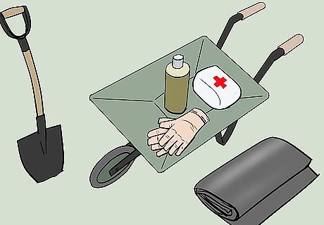 Gather your supplies. Some items to include are gloves, shovels, garbage bags, and wheelbarrows. Don't forget first aid supplies, drinking water, and snacks. Prepare a list of phone numbers you might need, including emergency services, waste management, and environmental departments.