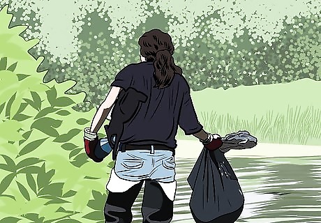 Pick up and bag garbage. Wheelbarrows can be helpful for moving larger pieces of garbage. Keep in mind that removing large objects, even if man-made, might be more disruptive to the environment than leaving them there since they may be providing habitat for fish. If a large object is more than half buried, or might kick up a lot of sediment by removing it, leave it there. If a large item looks like it could possibly be dangerous or toxic, contact your local environmental agency to see if it should be removed.