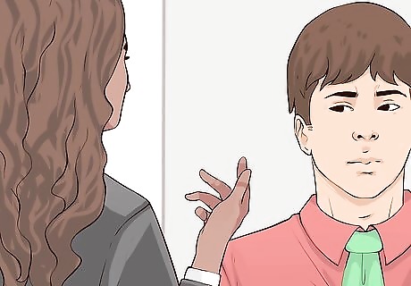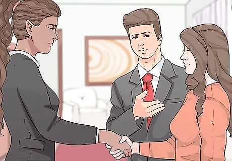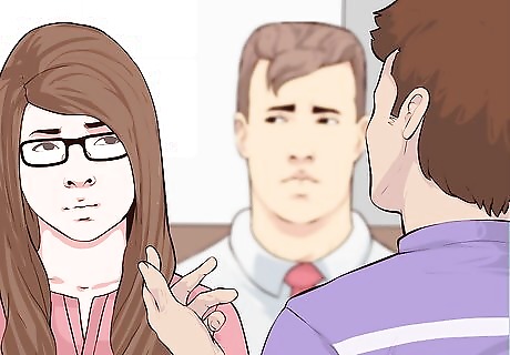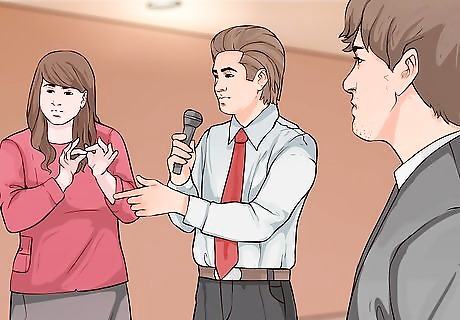 Position yourself out of the sightline of the interpreter and the deaf person. Make sure you are standing in a spot where the interpreter can be seen by the deaf person. Do not stand between or in the sightline of the interpreter and the deaf person. You may ask the interpreter where they would like you to stand or have the interpreter stand to the side of you in their chosen spot. The deaf person may also prefer to sit in the front of the room, close to the interpreter, so she can see the interpreter clearly during the meeting.