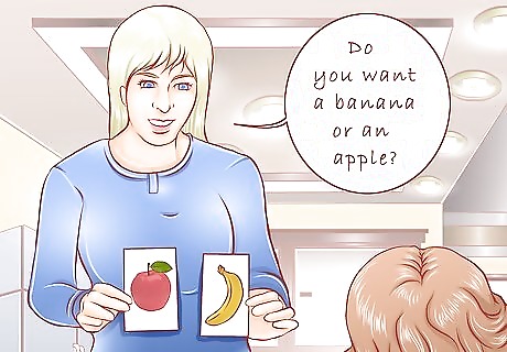 Use visual cues when asking questions if echolalia becomes a problem. When asked a question like "Do you want a banana or an apple?", some children will automatically respond "apple." This can cause frustration for the child, and they may not know how to express that this is what they actually want. Confirm this choice before moving forward. Ariane Zurcher uses pointing to confirm her daughter's choices. For example, "Point to this hand if you want an apple, and this hand if you want a banana." Other visual cues could include picture cards, or holding up the objects (when applicable). If your child can reliably answer yes/no questions, try asking one of these to confirm. "You want a banana?"