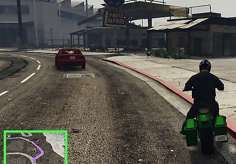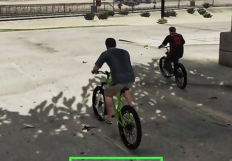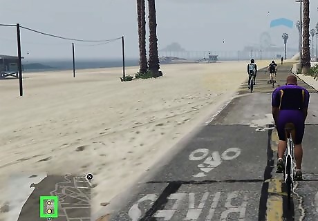 Follow the checkpoints. Once on the bike, repeatedly tap the X button, A button, or Shift key to accelerate while using the toggle to steer. Once again, follow the yellow checkpoints on your map to advance. Once you reach the last checkpoint, your character will automatically dismount the bike, and begin the last section of the triathlon.